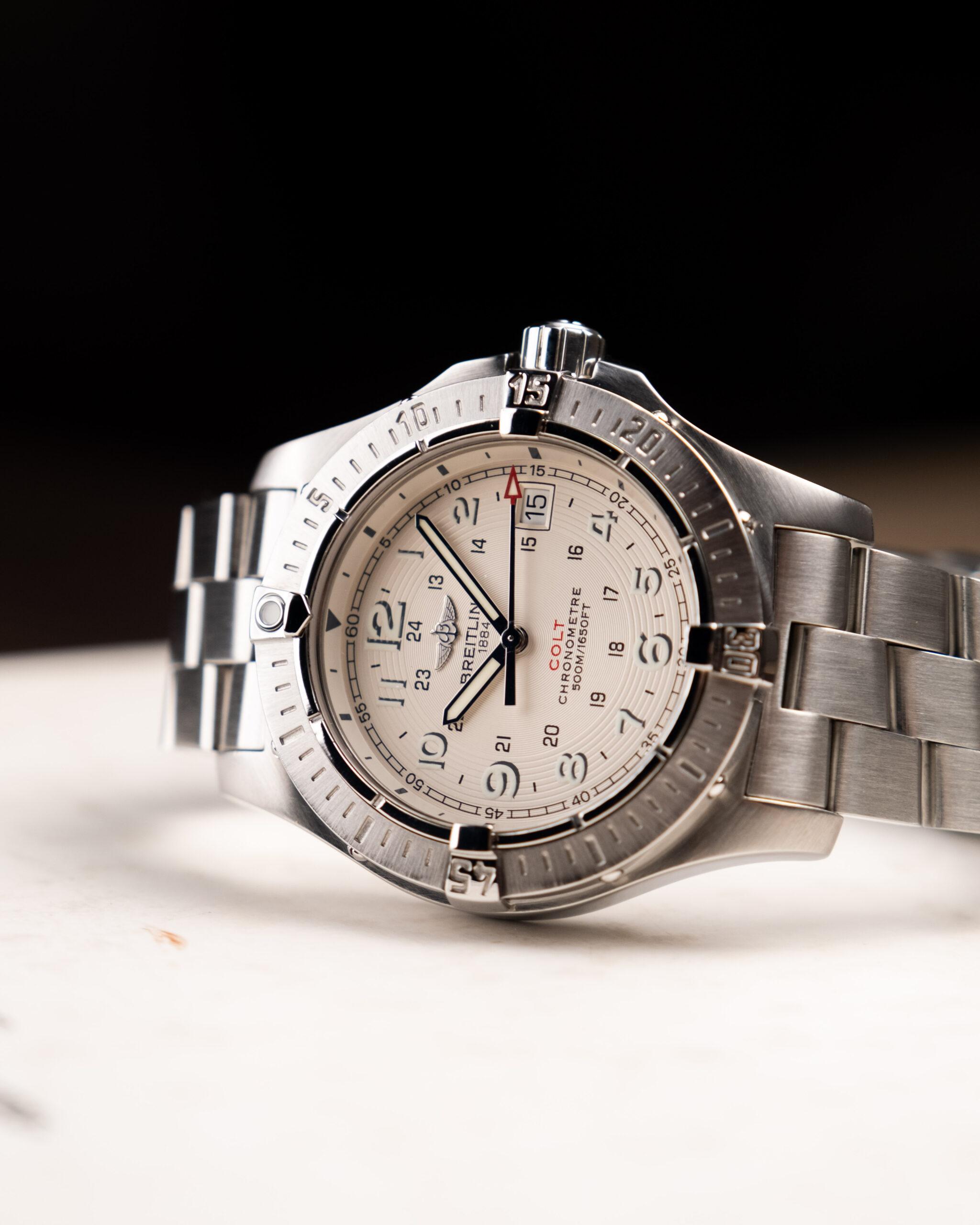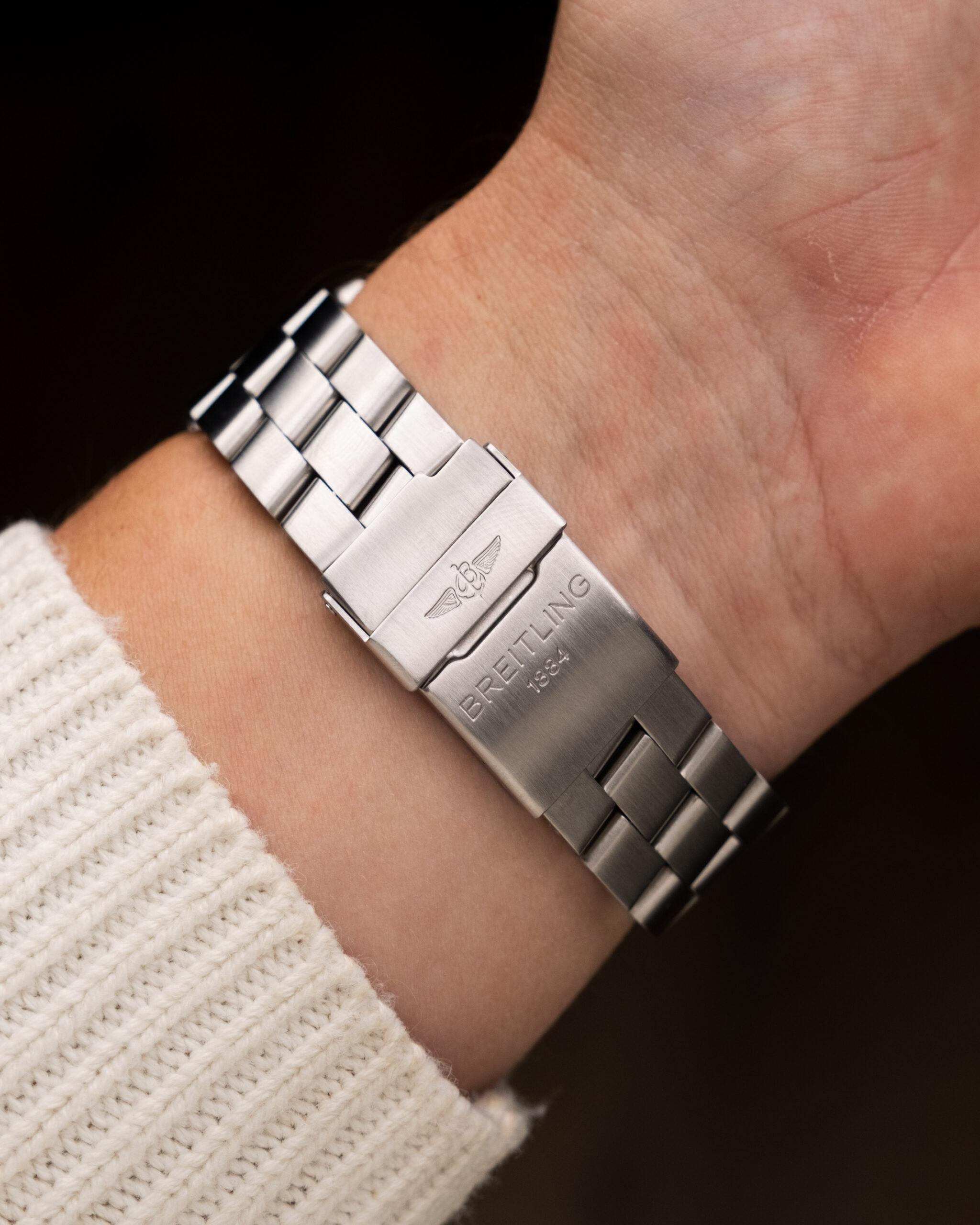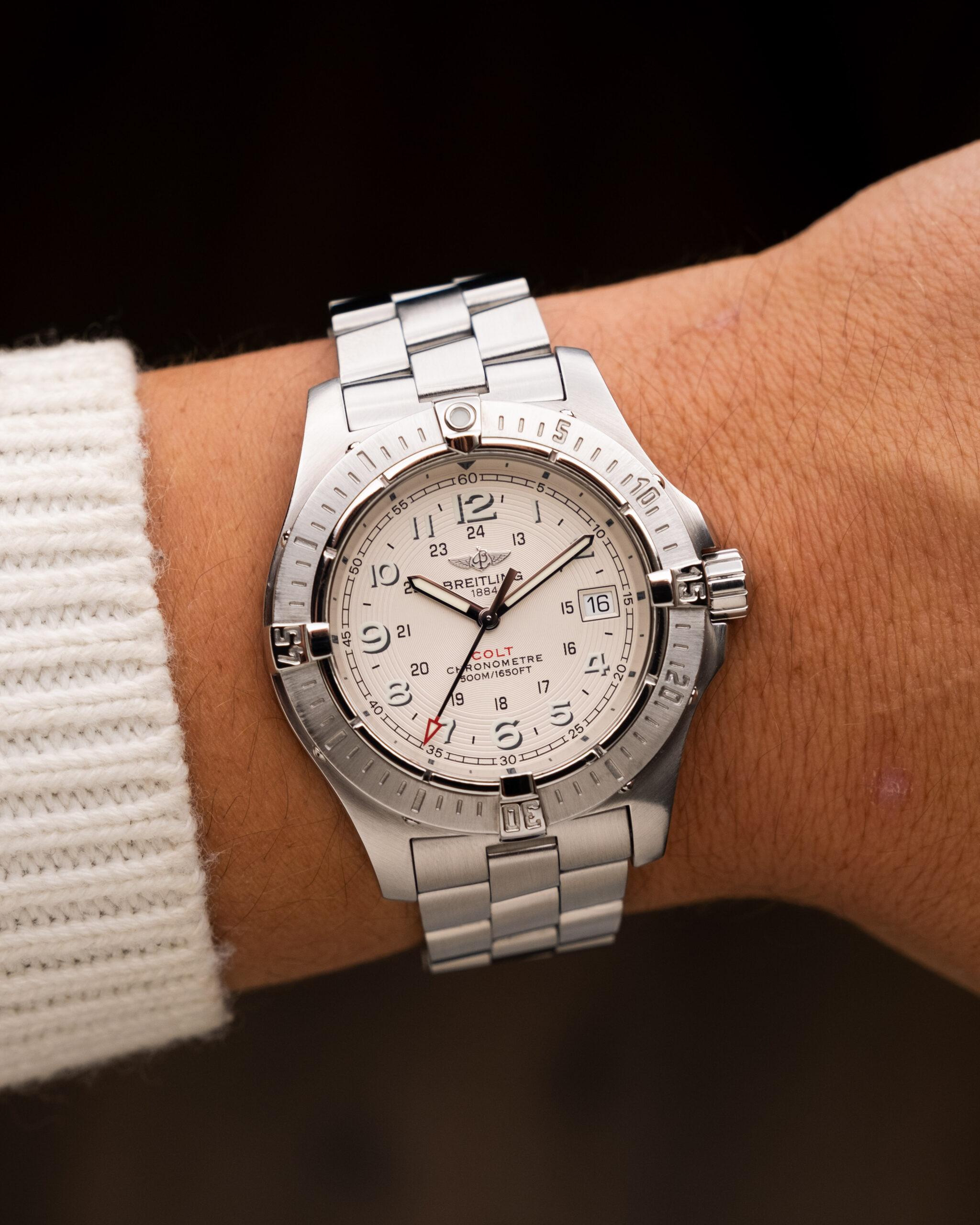 Za Breitling precej konzervativnih 41mm premera, na tej uri izpade res super. Všeč mi je tudi detajl 13-24 številk na številčnici pa seveda rdeča konica sekundnika. Res zanimiv diver po odlični ceni, pride v full setu in še z originalnim računom iz leta 2008! Super alternativa za vse, ki vam je všeč Rolex Explorer II Polar 😉
