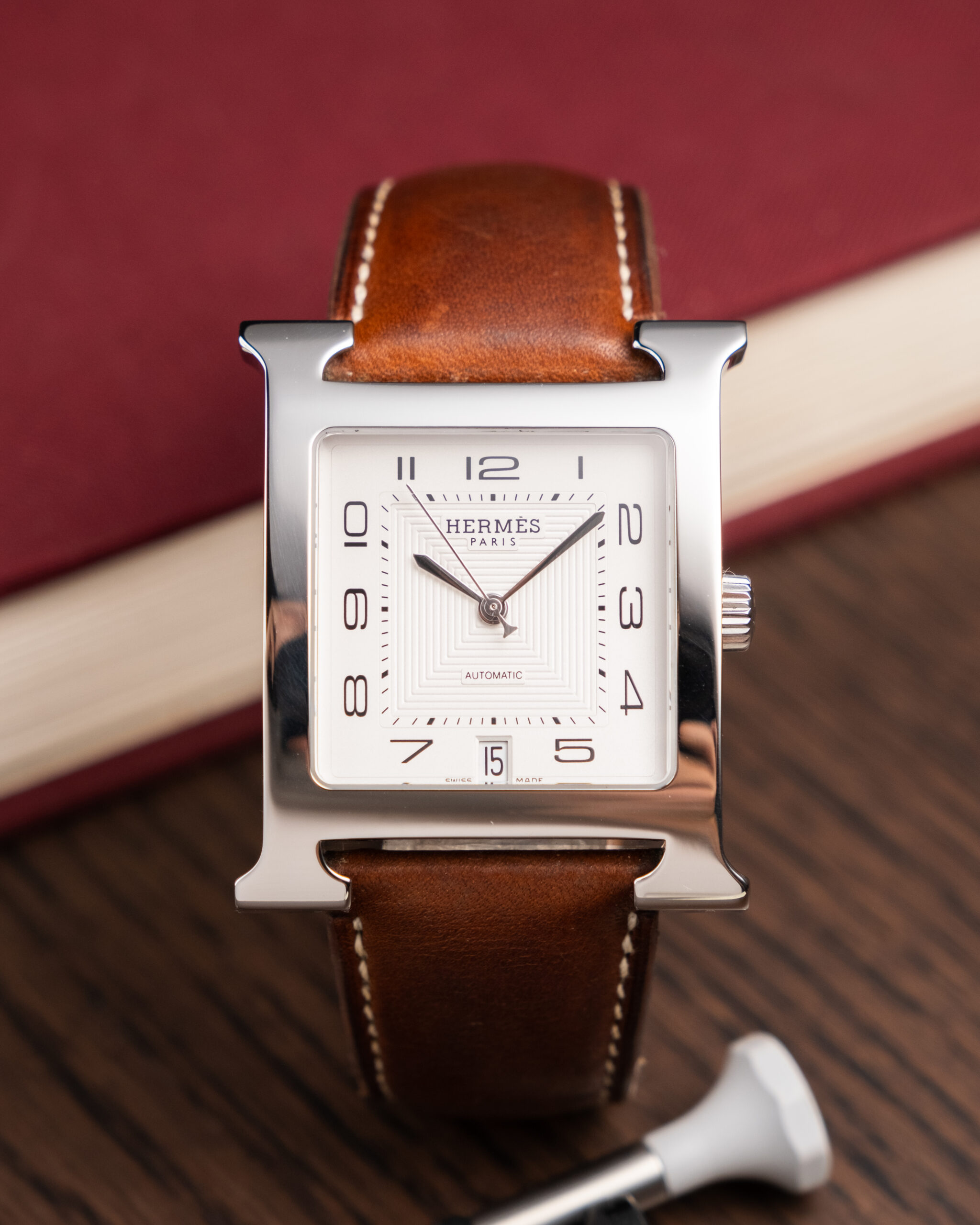 Tale Hermes je odlična izbira za nekoga, ki išče unikaten kos v rangu +-1000€. Gre za ikonično "H" obliko, ki je zelo očiten podpis znamke. Avtomatski mehanizem je v popolnem stanju in ura je pripravljena za naslednjega lastnika.