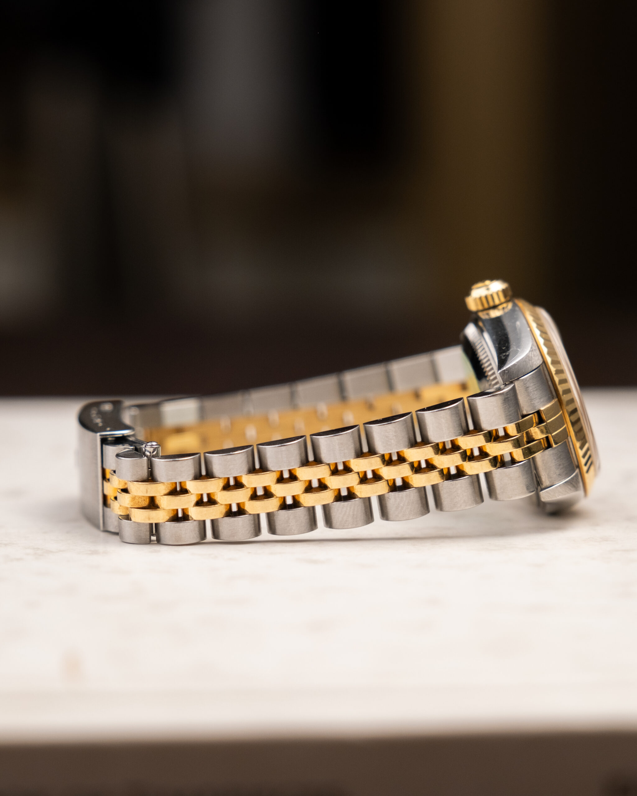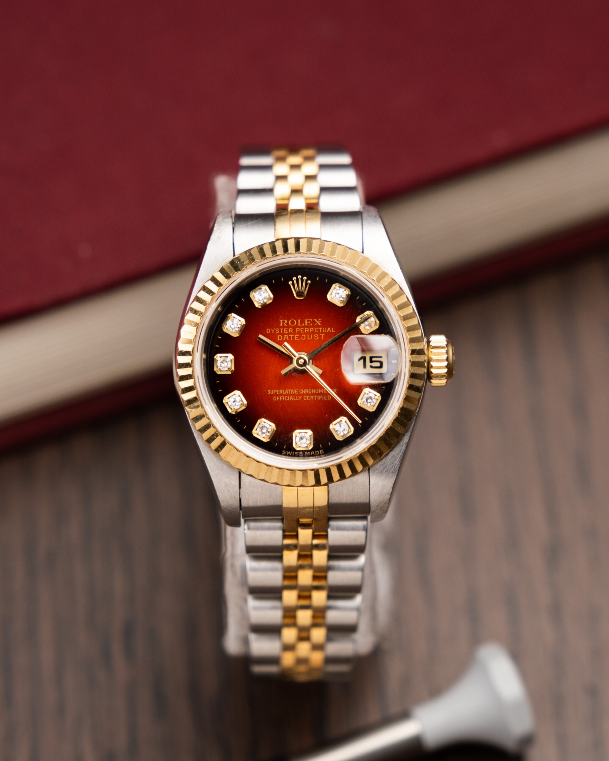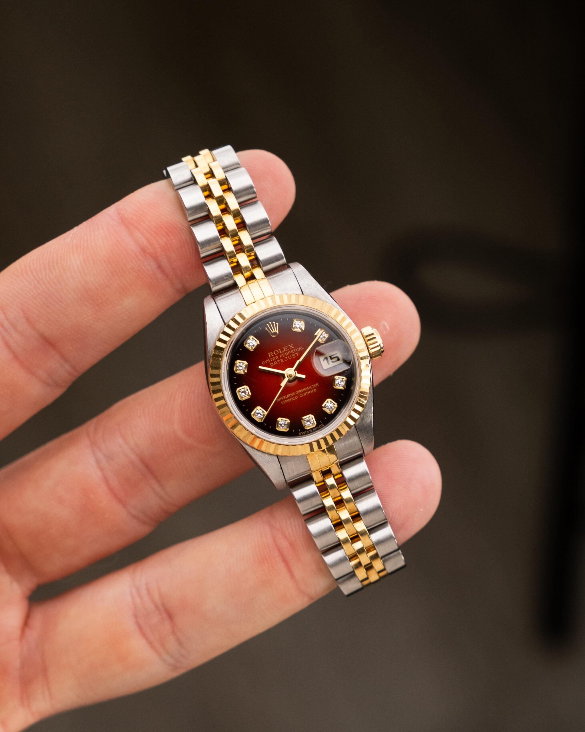 Vintage Rolex Datejust je klasika v ponudbi. Sploh teli 26mm “gumbki” iz 90ih. Tokrat v kombinaciji jekla in rumenega zlata in s prelepo “vignette” rdečo številčnico, kjer se barva iz živo rdeče pretaka v črno, za povrh vsega pa so na indeksih še diamanti. Pozor, tokrat gre za novejšo, 79173 referenco!