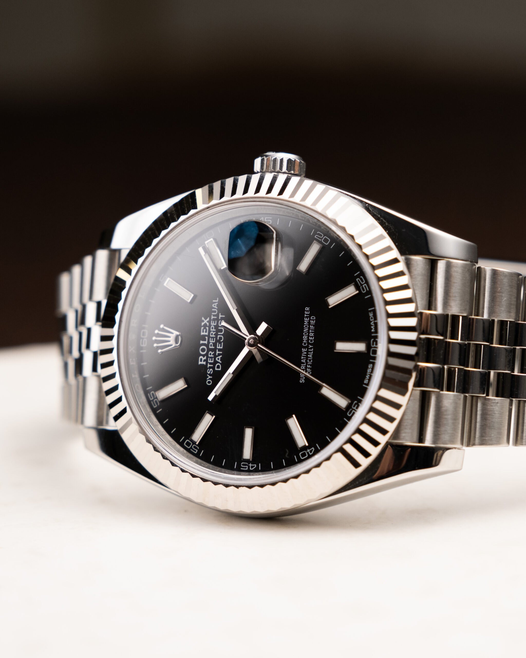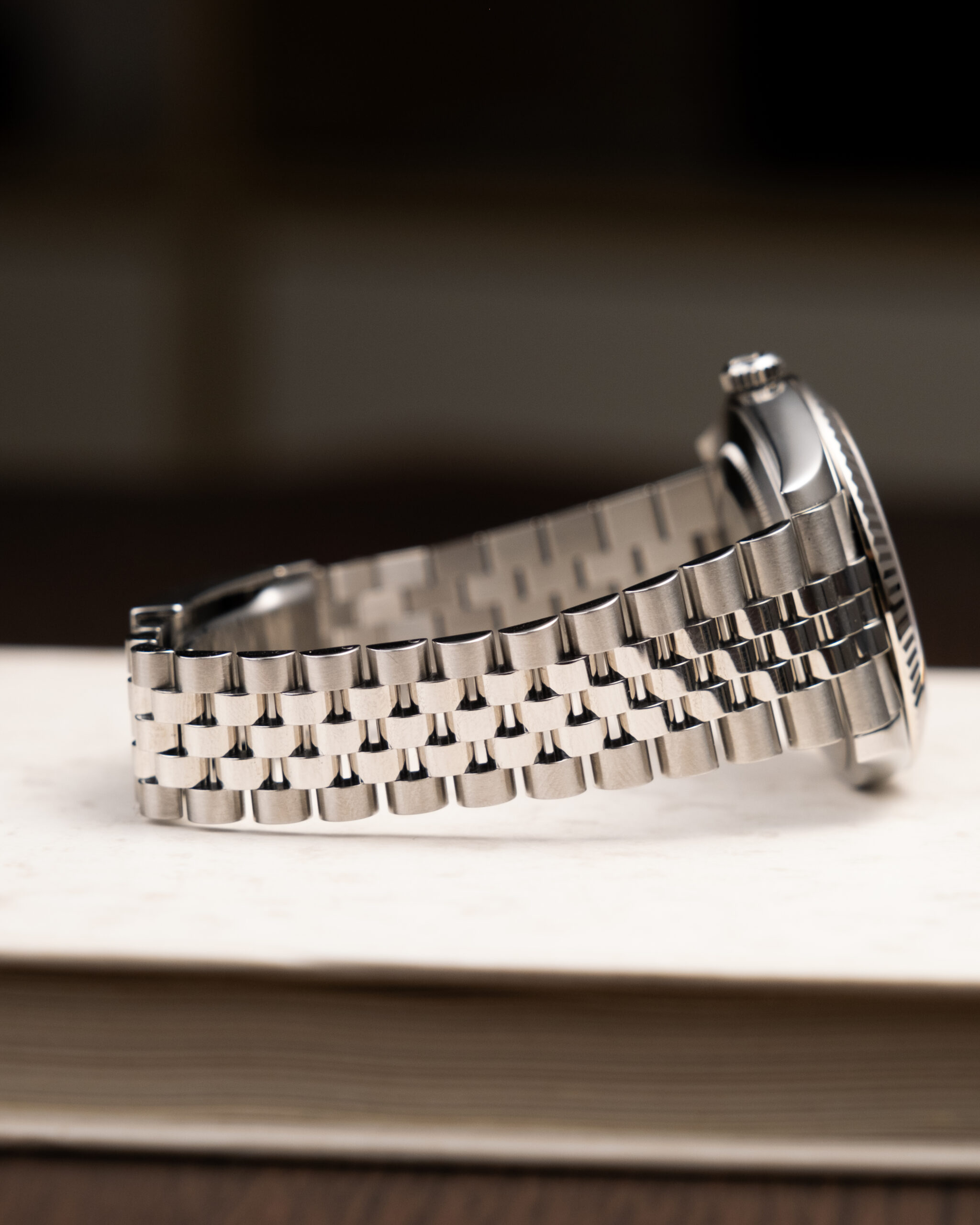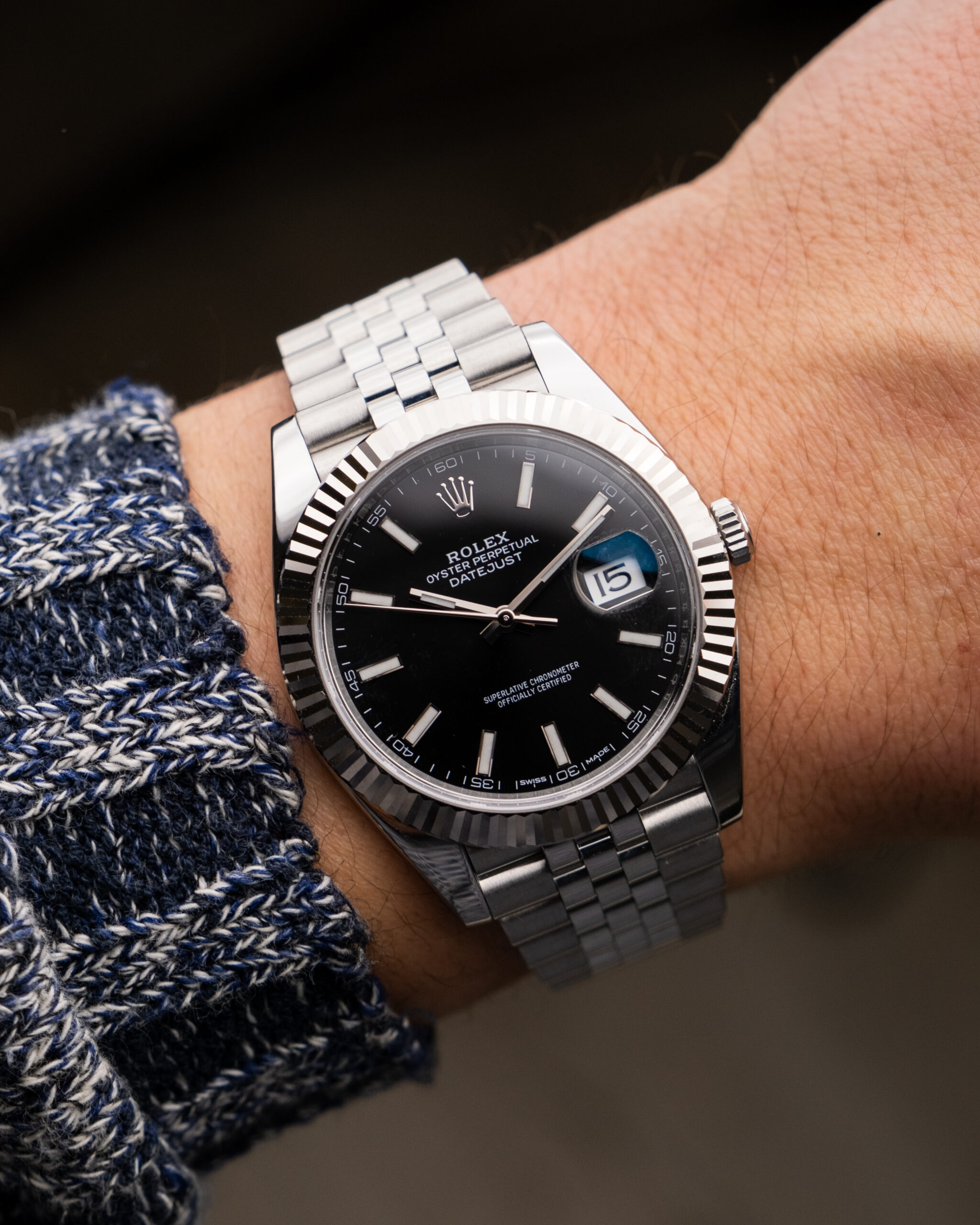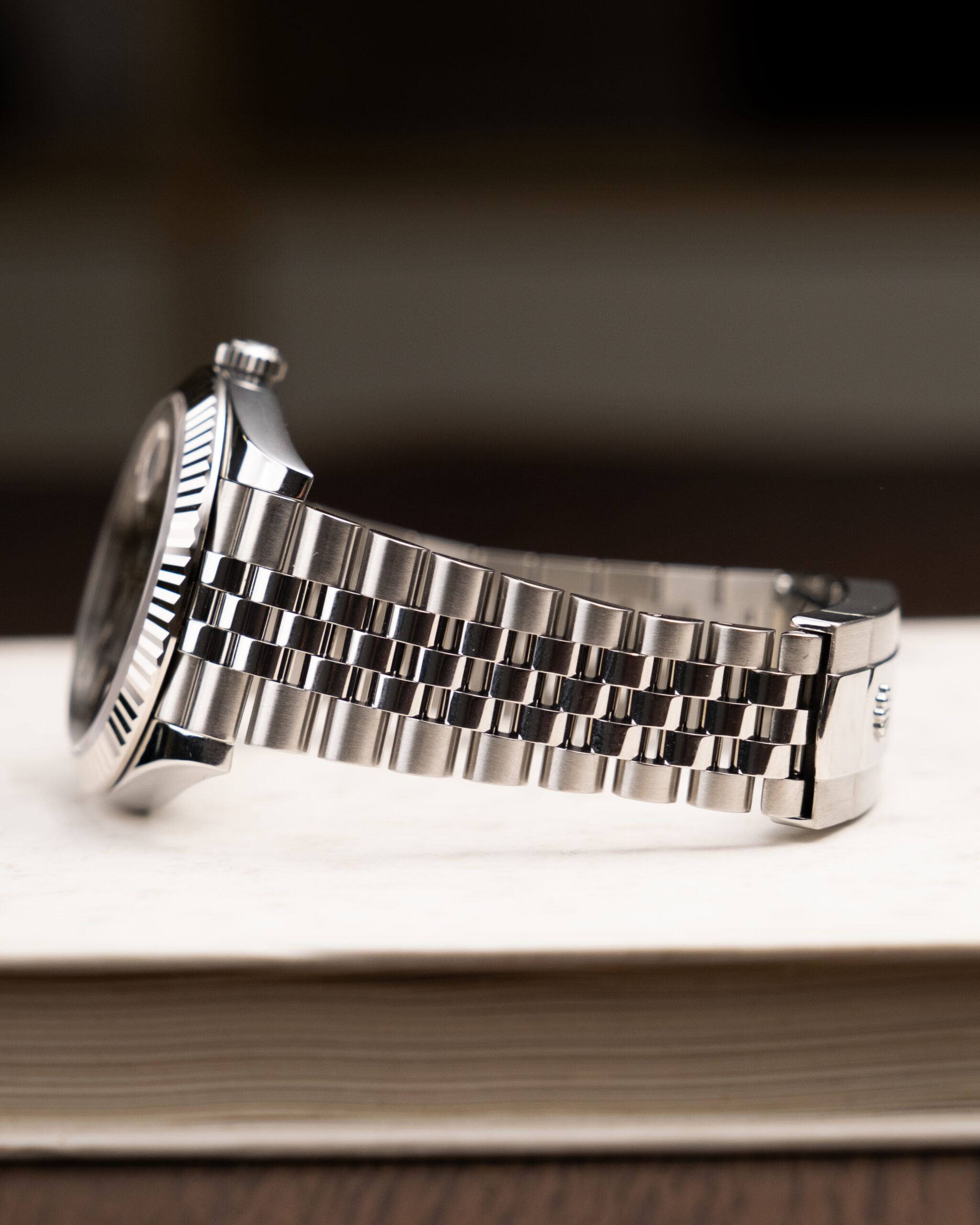 Rabljen Rolex Datejust 41 z jubilee zapestnico in fluted luneto. Tokrat s črno številčnico in v odličnem stanju. Mislim, da je to moj najbolj prodajan moderen Rolexov model na 15 čez – faktorji so verjetno popolna velikost, zanesljiv avtomatski mehanizem in ikoničen dizajn.