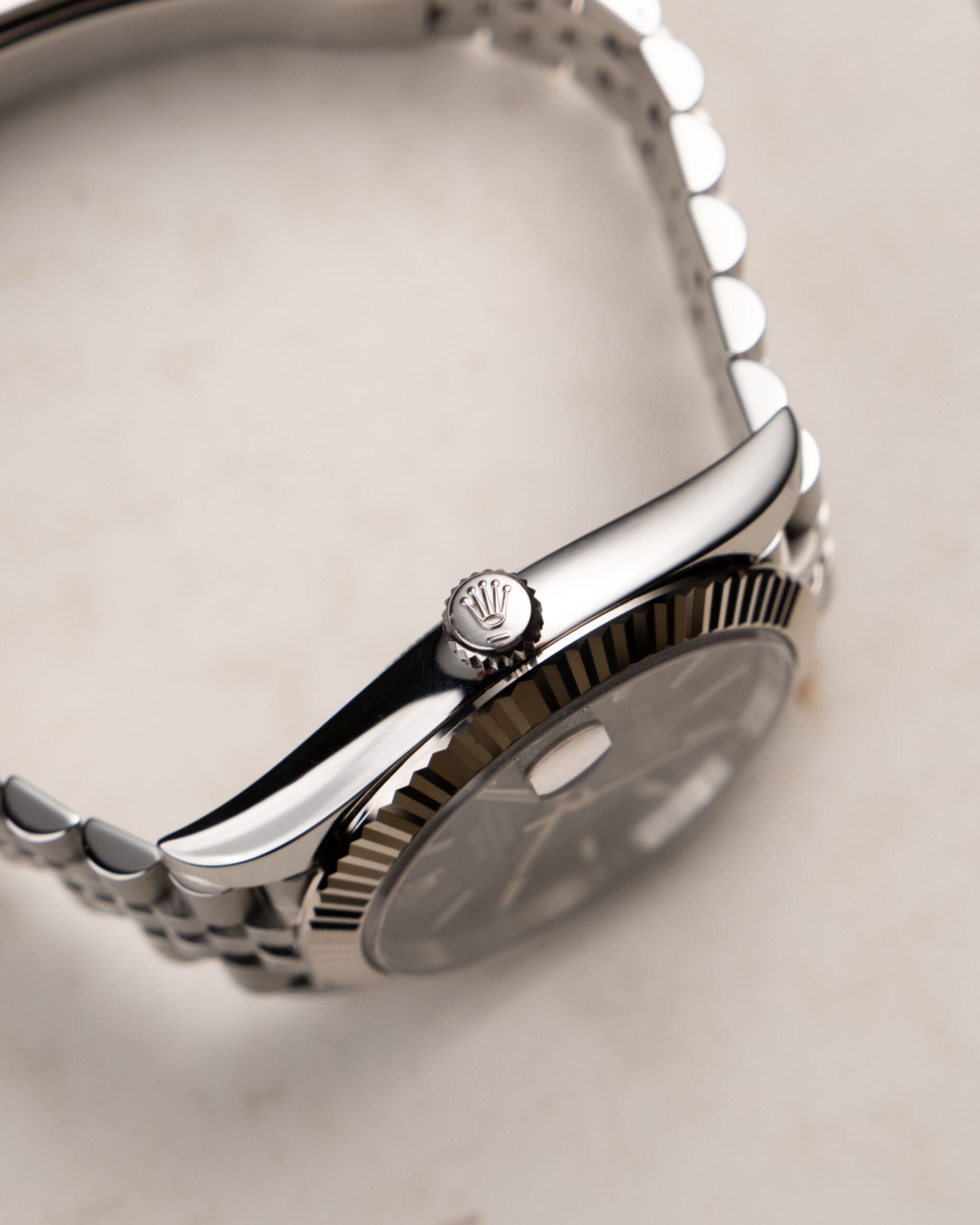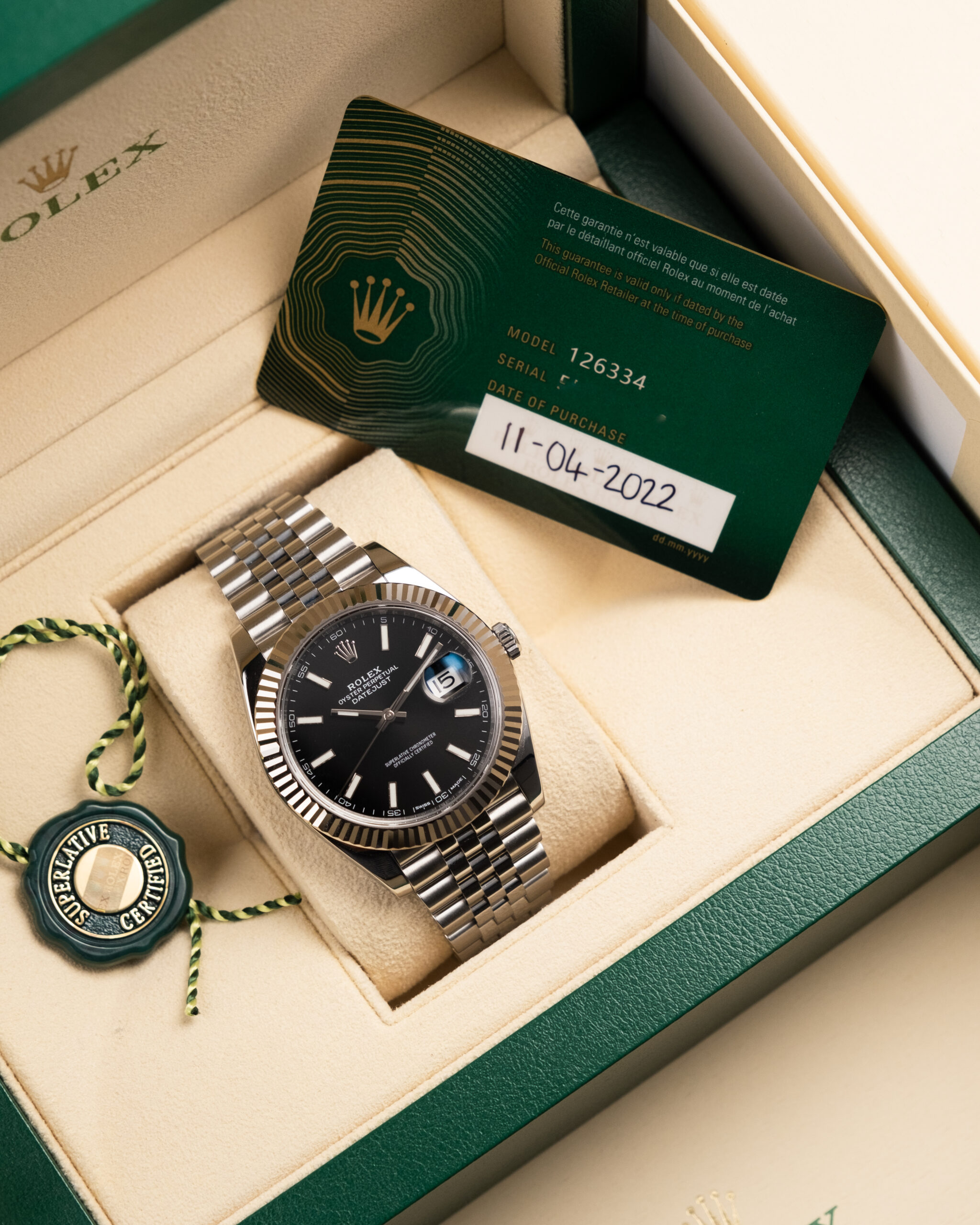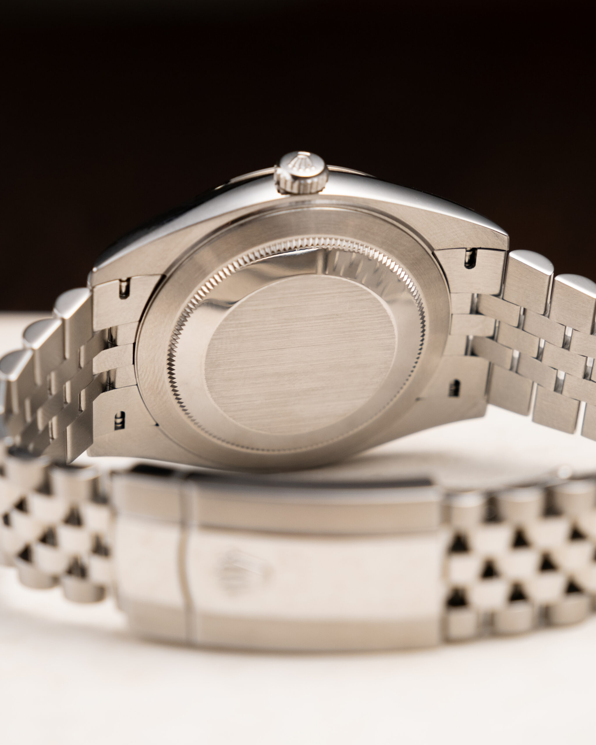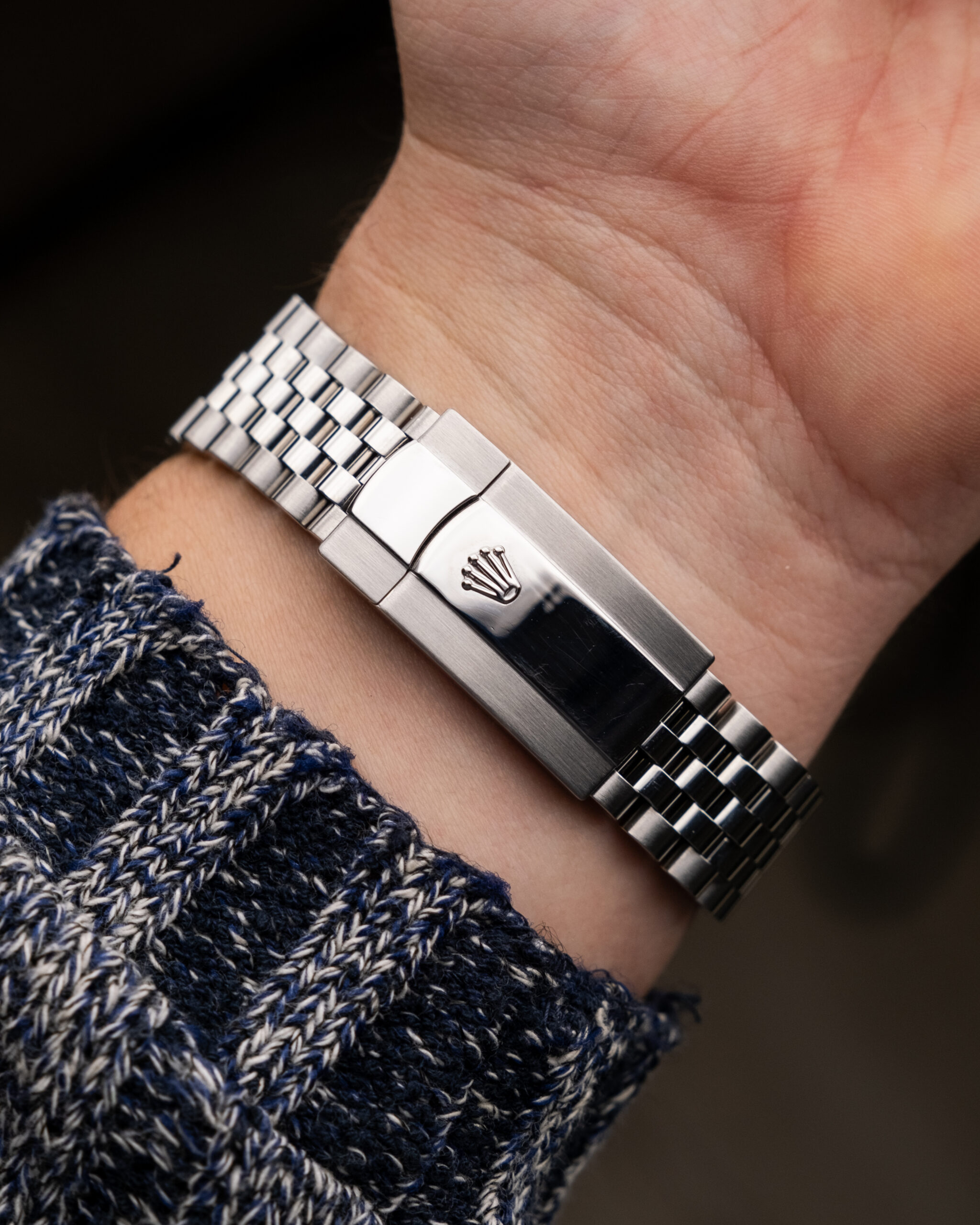 Rabljen Rolex Datejust 41 z jubilee zapestnico in fluted luneto. Tokrat s črno številčnico in v odličnem stanju. Mislim, da je to moj najbolj prodajan moderen Rolexov model na 15 čez – faktorji so verjetno popolna velikost, zanesljiv avtomatski mehanizem in ikoničen dizajn.