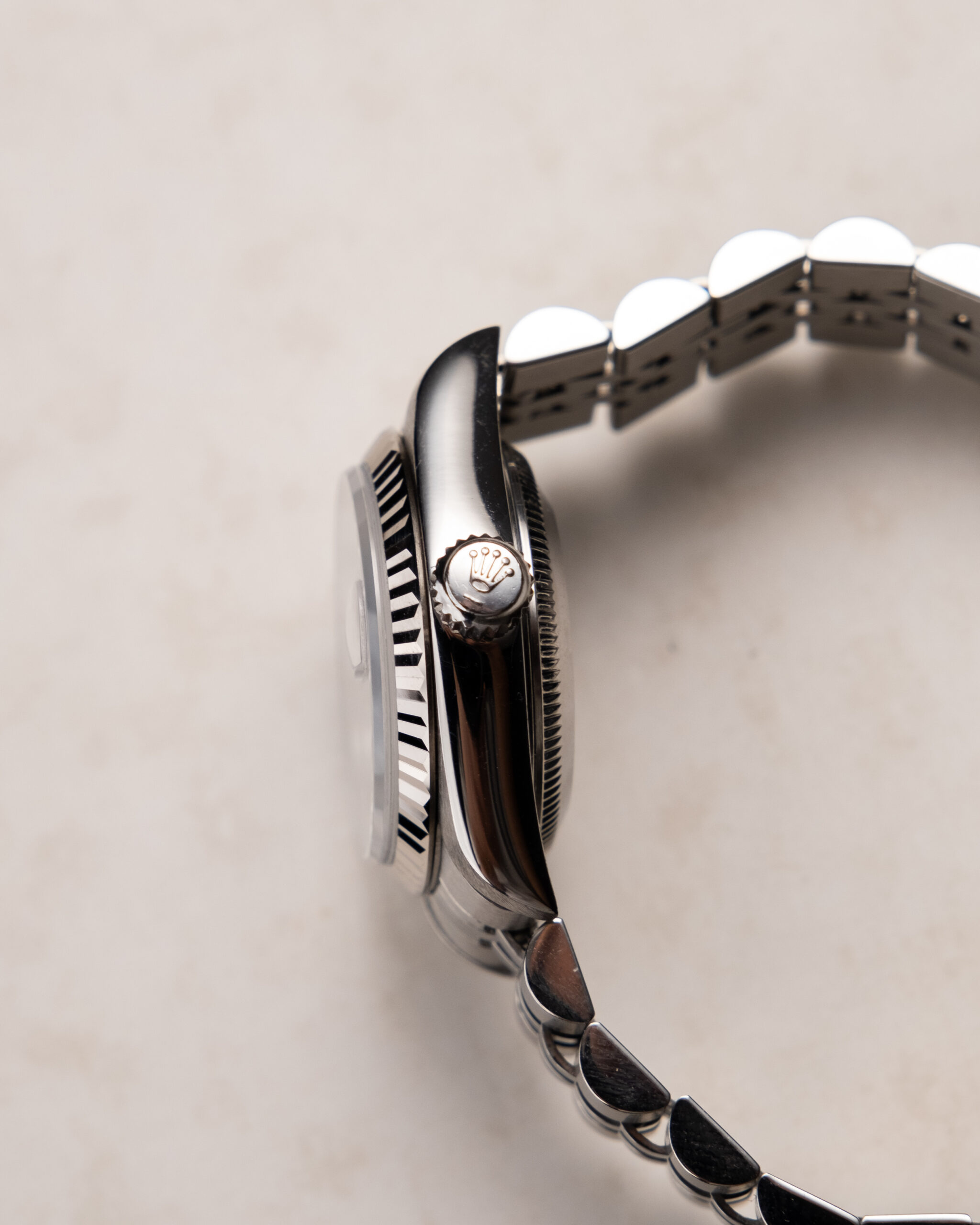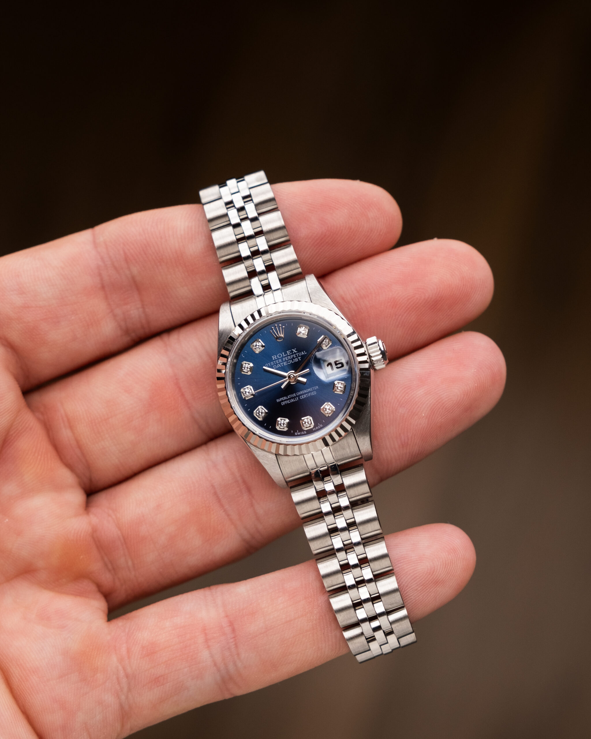 Vintage Lady Datejust z diamanti, ki te ne spravi v bankrot. Gre za še eno precej redko specifikacijo v svetu starih Datejustov. Modra številčnica v kombinaciji z luneto iz belega zlata res dvigne uro na drug nivo.